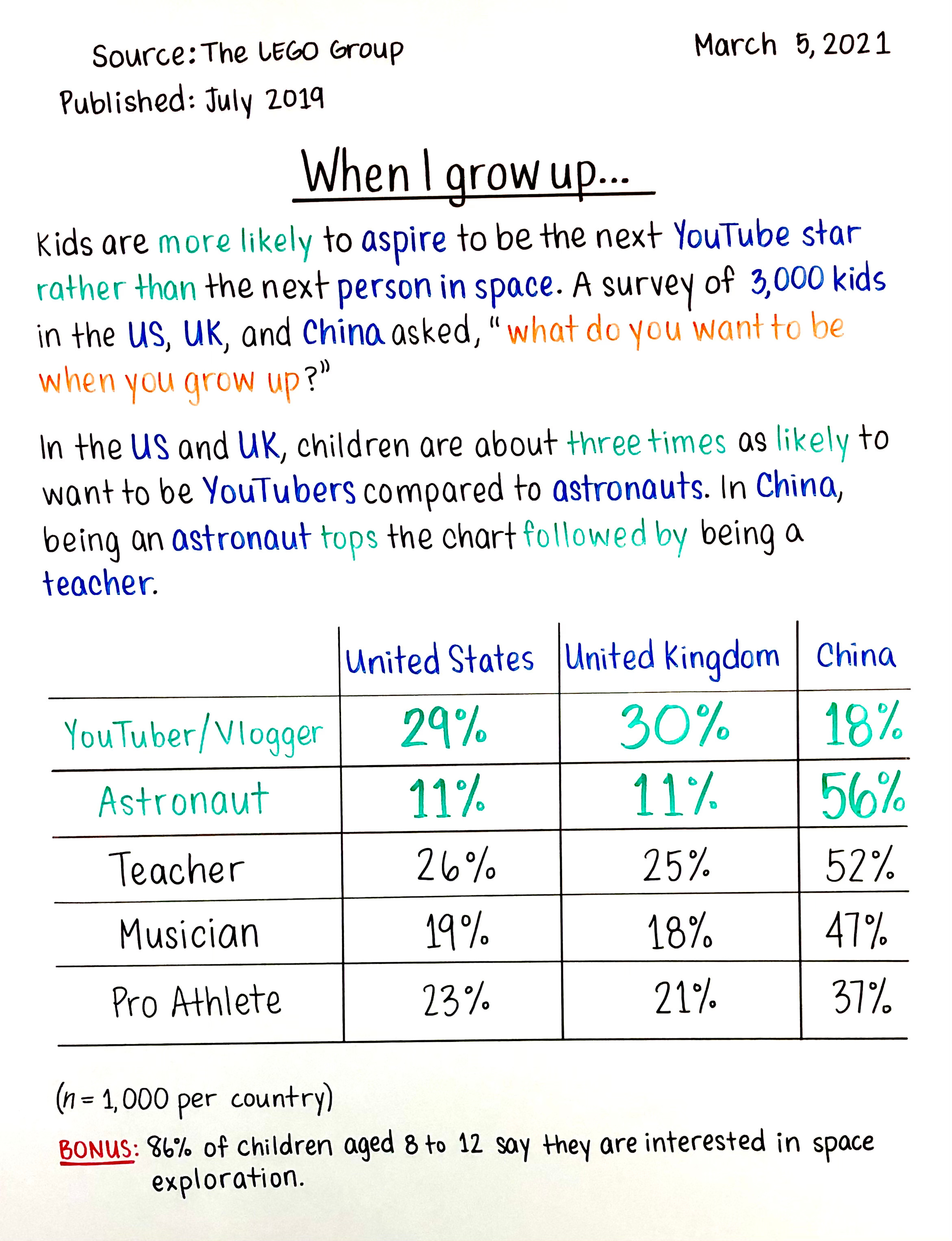 Kids are more likely to aspire to be the next YouTube star rather than the next person in space. A survey of 3,000 kids in the US, UK, and China asked, “what do you want to be when you grow up?”