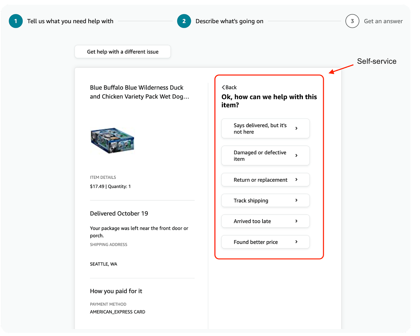 In the early 2000s, Amazon invented a self-service tool called “Where’s my stuff?” that allows a customer to track their order from the fulfillment center to their front door. They can take similar actions that a customer service agent would have taken, but do it on their own time and access it 24/7.